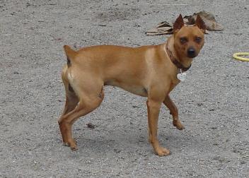 Maxwell Max is a 2 yr old min pin (or maybe a manchester? Anyone have thoughts on that?). He weighs 19 lbs. He's a VERY cool dog-- he's playful, happy, cuddly; he loves other dogs but he is a bit dominant. He's fine with cats and all the livestock here. He'd do best with a fun loving, active family; he's not really for the elderly (much too active). |