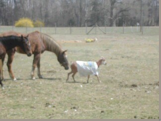 PINKY This poor girl was dropped off at a local butcher's to be slaughtered. She was almost completely hairless due to long term neglect; she had been kept chained to a dog house and fed only dog food. When her owners got sick of her, they took her to the butcher-- who felt sorry for her, and called us to come get her!! She is slowly regrowing her hair, but has to be carefully protected from the sun and the elements. She was badly sunburned when she came. We tried different types of t shirts, sweat shirts, and dog coats along with loads of sunscreen to protect her over the summer... now that winter is coming, she has a special insulated "goat coat" that will hopefully keep her warm enough. |